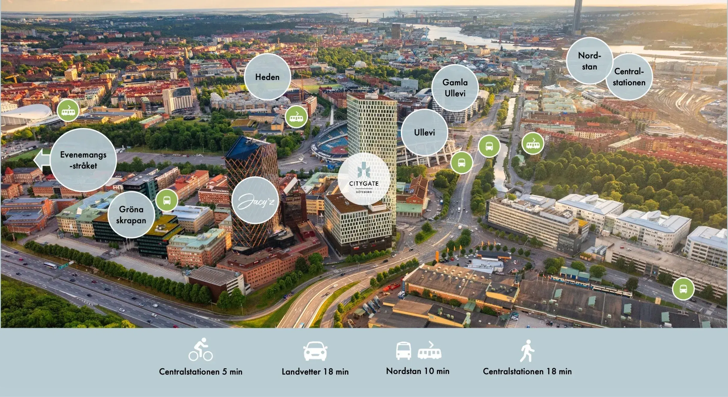 Raka vägen till Landvetter flygplats, med bil är du vid inrikeshallen på 18 minuter utan de fördröjningar som stadens trafik innebär. På 18 minuter promenerar du även i maklig takt till tåget på Centralstationen från Citygate. Smidigt!