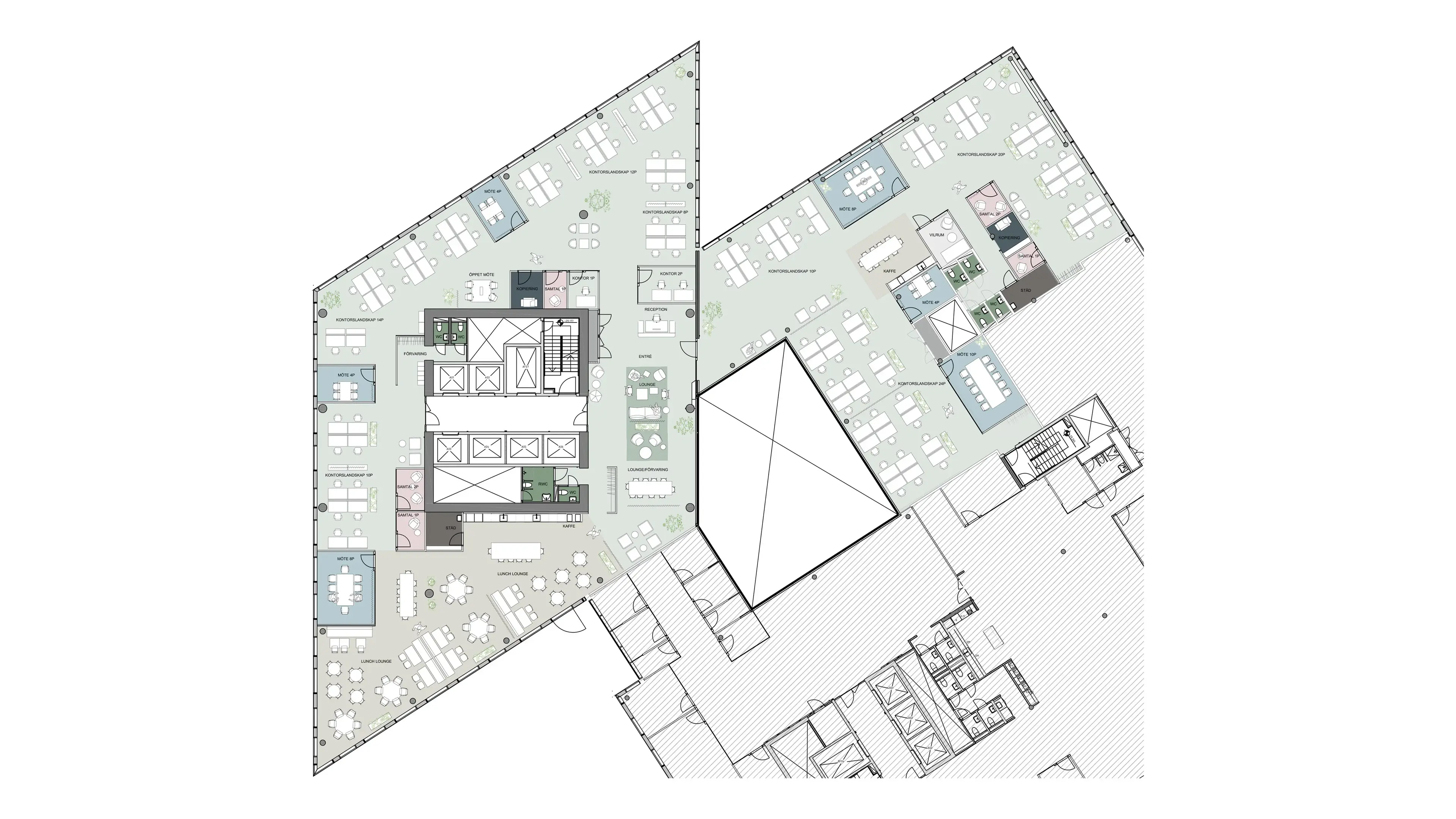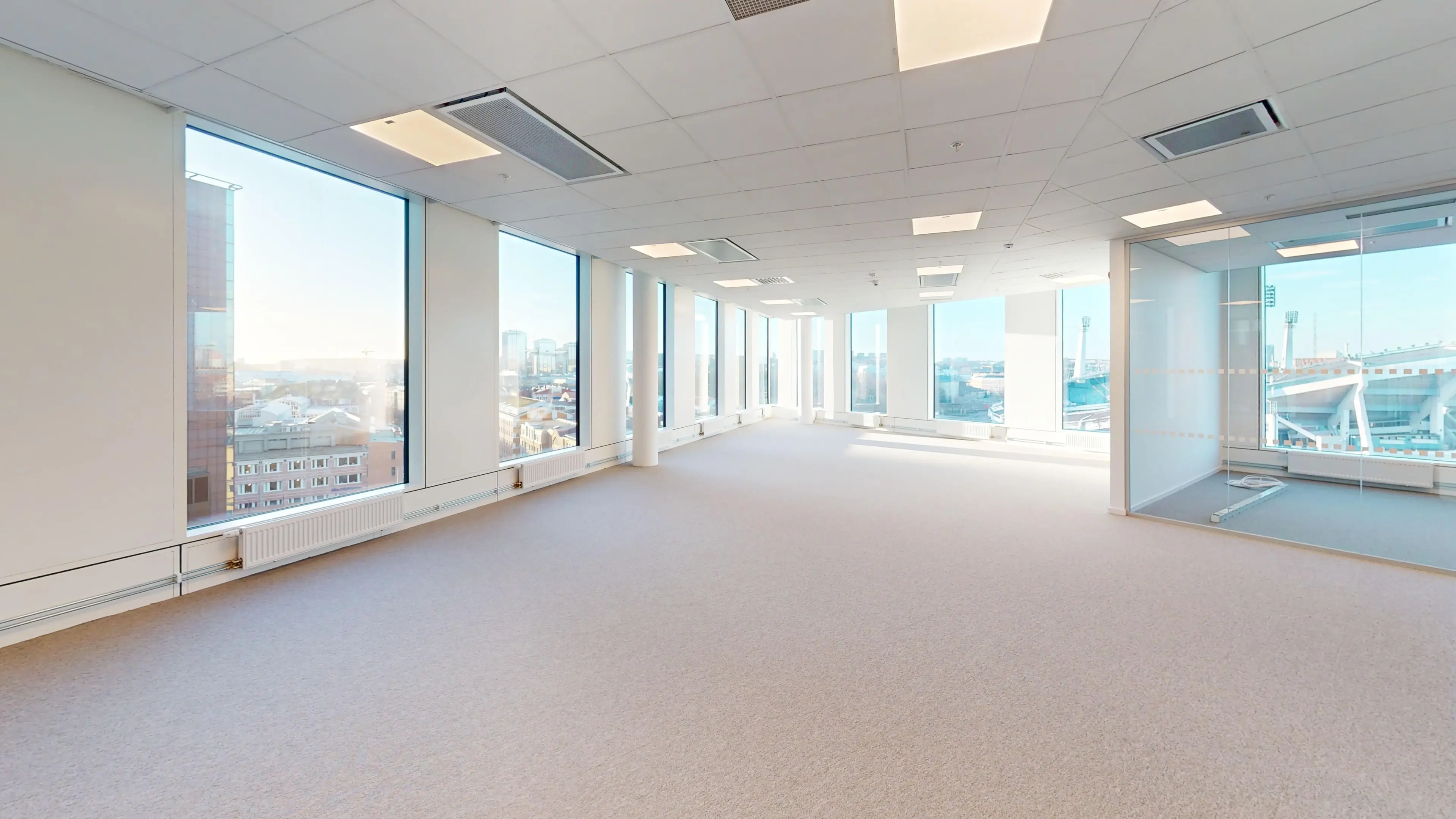 Sjunde våningen i Citygate är 1319 kvm och har utrymme för över 100 arbetsplatser. Här blickar du ut mot staden i flera riktningar och samtidigt in mot vårt stilrena, öppna atrium som sträcker sig flera våningar högt, vilket gör lokalen ljus och luftig. Utanför finns både stadspuls och vilsam grönska. Här finns många platser att samlas och umgås men också lugnare rum för möten i avskildhet. Det fräscha och centrala pentryt och våningens kaffestationer blir naturliga mötesplatser. Våning 7 är en härlig lokal som går att dela upp i olika avdelningar eller funktioner om så skulle önskas.